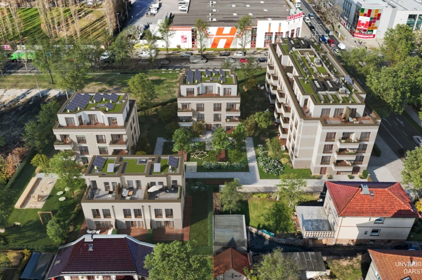 Das Wohnquartier besteht aus mehreren modernen Gebäuden, die sich harmonisch in die Umgebung einfügen und durch ihre klare Architektur hervorstechen. Die verschiedenen Hausstrukturen bieten eine breite Auswahl an Wohnmöglichkeiten und gewährleisten so eine hohe Lebensqualität für alle Bewohner.