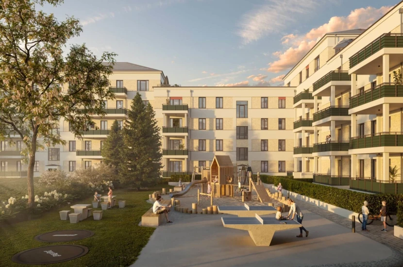 Für zusätzlichen Komfort sorgen Kellerabteile, Kinderwagen- und Fahrradstellplätze sowie eine Tiefgarage mit 119 Stellplätzen. Auch Familienfreundlichkeit wird hier großgeschrieben: Eine Kita, mehrere Spielflächen und autofreie Hofanlagen schaffen eine lebendige und sichere Quartiersatmosphäre. Gleichzeitig sorgen begrünte Dachgärten und ein nachhaltiges Regenwassermanagement über Rigolen für ökologische Nachhaltigkeit.